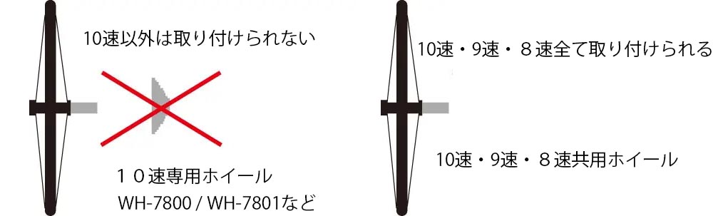 (WH-7800 / WH-7801 など初期10速ホイールは10速専用設計のため例外的に10速以外のスプロケットを取り付けることができない。)